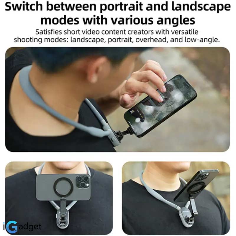 محدودیت زاویه فیلمبرداری با هولدر گردنی موبایل تلسین مدل TELESIN-MNM-001 از بین رفته است. این محصول به شما امکان میدهد دوربین گوشی خود را به هر زاویهای تنظیم کنید. چه نیاز به فیلمبرداری به صورت عمودی (Portrait) برای استوریهای اینستاگرام و تیکتاک داشته باشید، چه به صورت افقی (Landscape) برای محتوای یوتیوب، و حتی زوایای خلاقانهای مثل نمای بالاسر (Overhead) و نمای زاویهکم (Low-Angle). این قابلیت، آن را به یک ابزار همهکاره برای هر نوع تولید محتوایی تبدیل کرده است.
