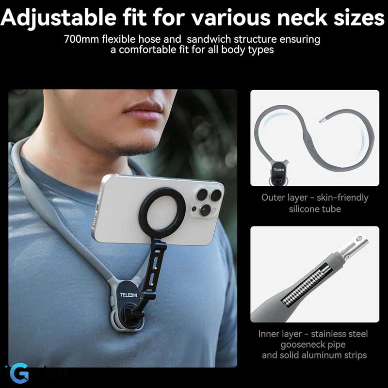 هولدر گردنی موبایل TELESIN MNM 002 با ترکیب طراحی راحت، ساختار مستحکم و قابلیتهای کاربردی، انتخابی بینظیر برای ولاگرها، موتورسواران، دوچرخهسواران و تمام علاقهمندان به تولید محتوای پویا و باکیفیت است.